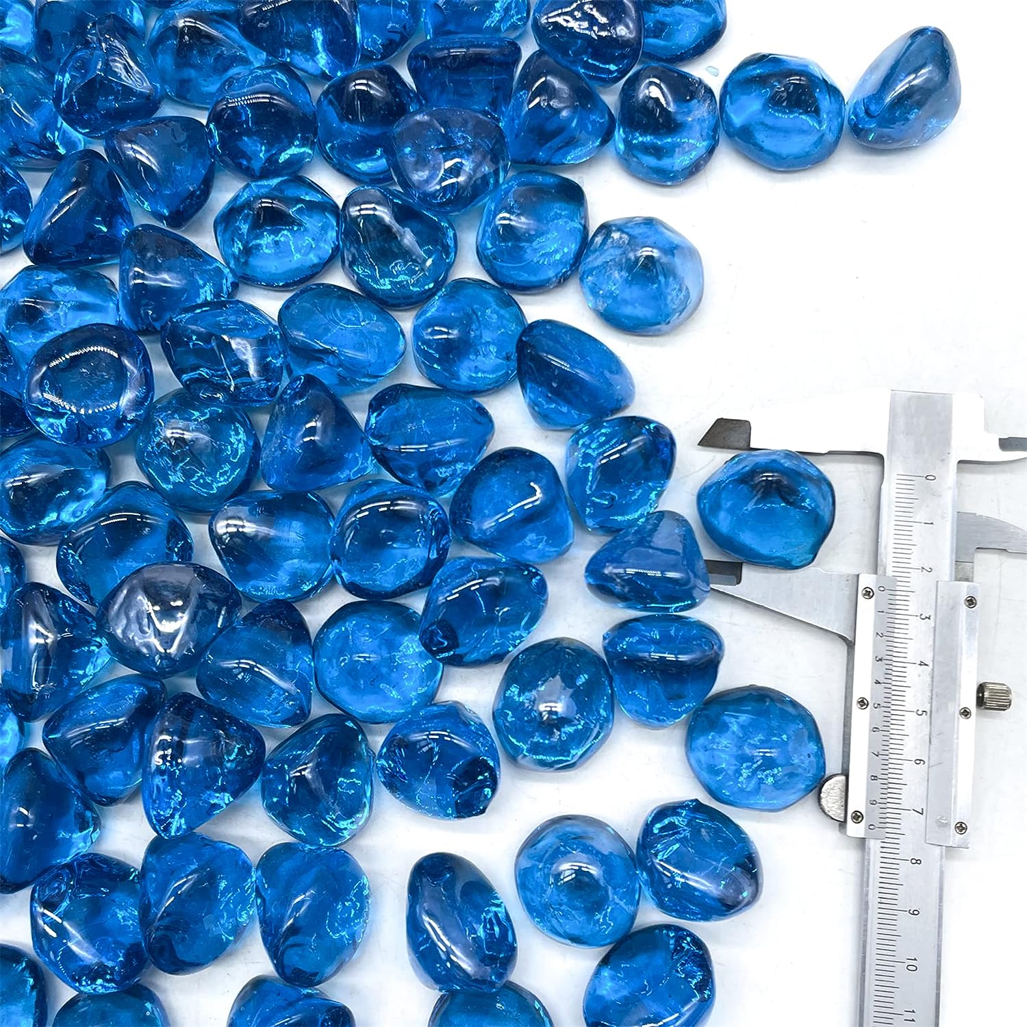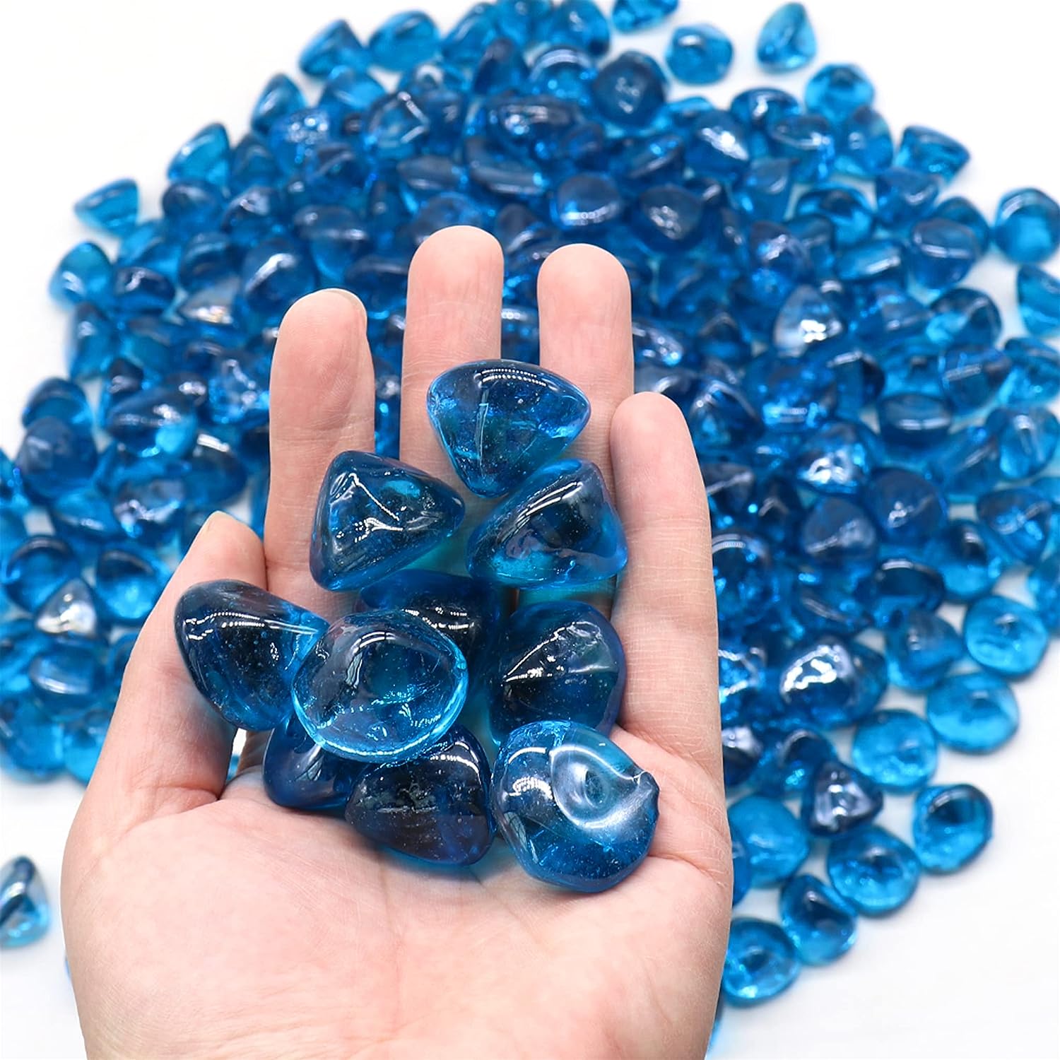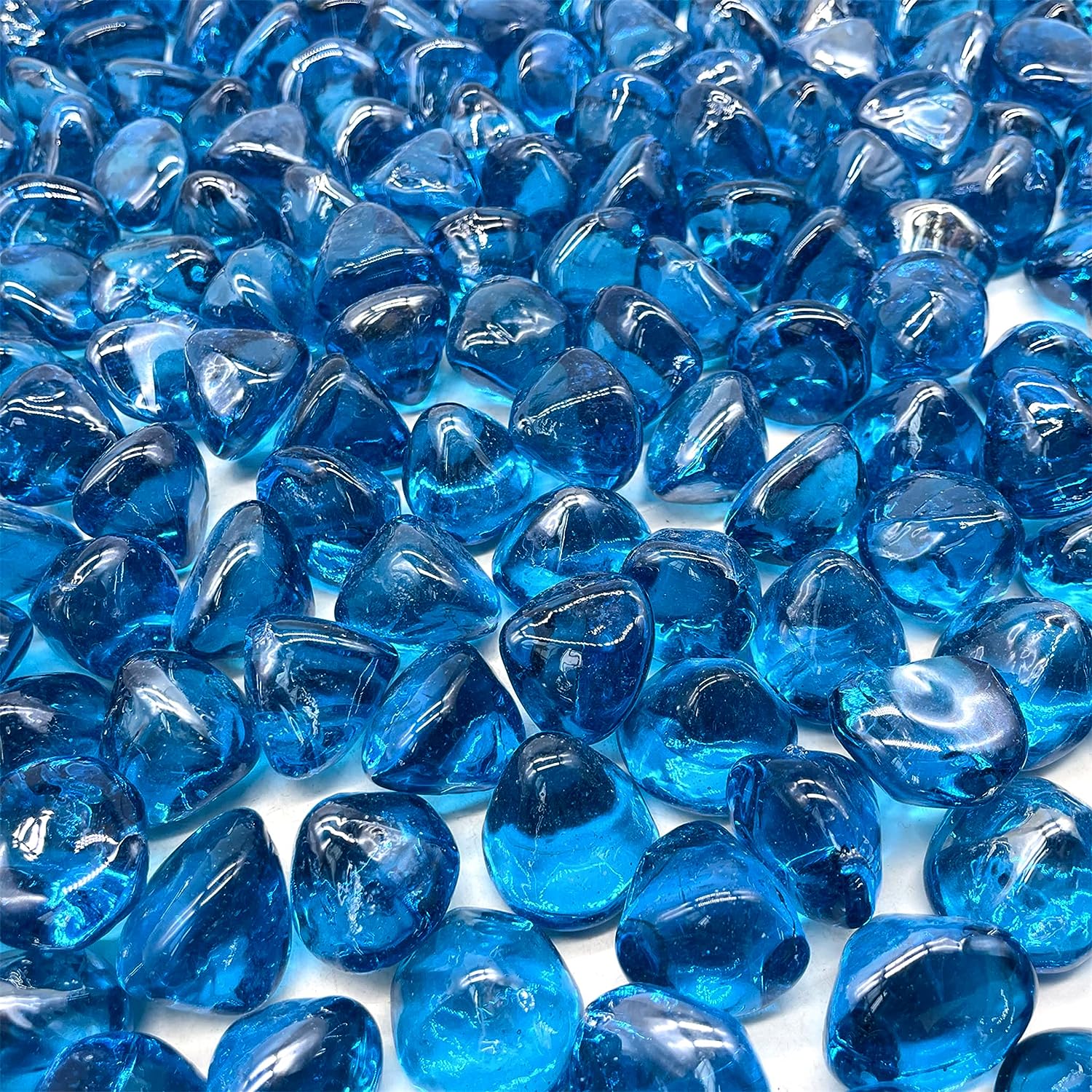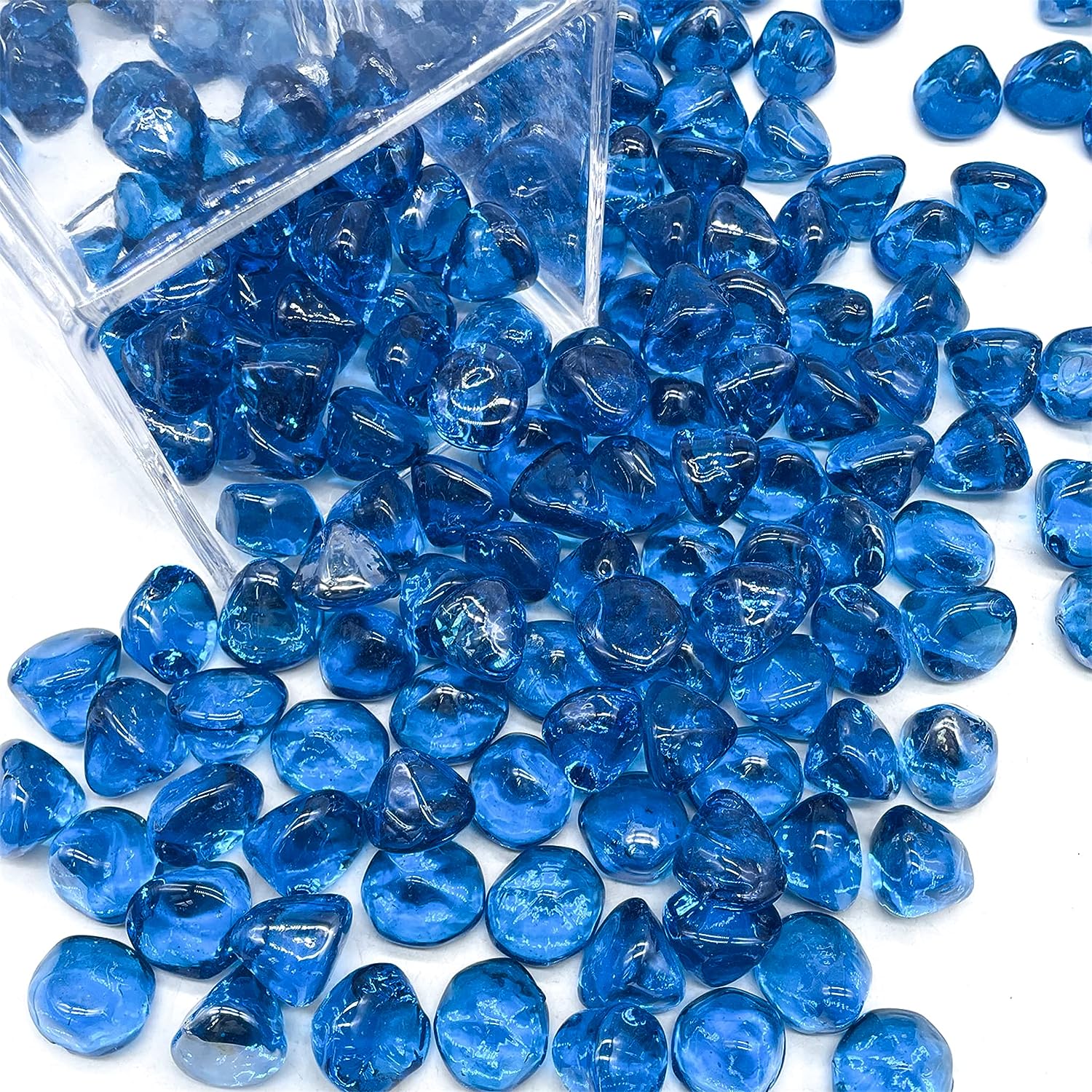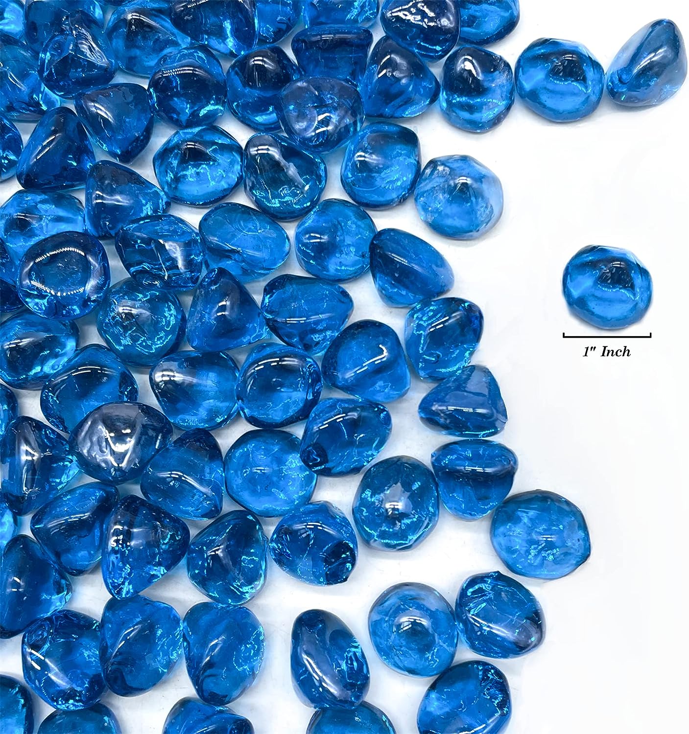 - DIAMOND STYLED GLASS - This set contains 10 pounds of diamond shaped fire glass. Each individual diamond is about an inch long, the perfect size that allows for both each individual diamond to be prominent alone and for all the diamonds to blend in together to create a unique, stunning, and regal looking firepit. Each individual diamond is unique as the exact size and shape varies between each glass diamond