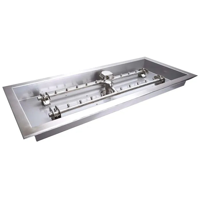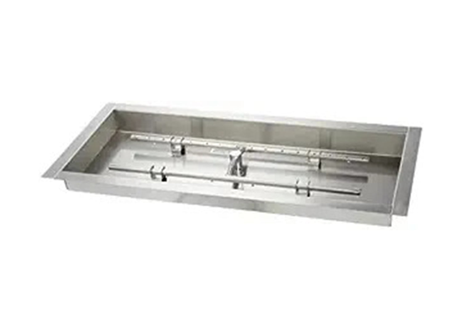 This part number utilizes not only the H-Burner but also the rectangle bowl pan and brackets making this a quick-fire pit drop in insert. These low profile H-burners are constructed of sturdy 304 stainless steel and are used in vented gas fireplace. The gas inlet (3/8"MPT) can be either left or right-hand application, holes can be pointed up for exceptional flame with glass media, holes down if adding sand to quiet gas. HPC offers H-Burners in many sizes designed specifically for use in outdoor fire pits. These burners use our raised hub design for shedding of water. Hub is a robust 1/2" coupler. The tubing is 1/2" #304 stainless steel with holes drilled at 30 degrees for inward flame pattern. Includes: H-Burner, pan and brackets. Features: BTUs: 60, 000. Fuel Type: Liquid Propane. Material: 304 Stainless Steel. Raised Hub Design. Tuned Gas Air Mixer Included. Stagger Port Burner Holes. Includes Pan, Burner and Brackets. Specifications: Overall Dimensions: 24" (L) x 12" (W) x 2.5" (D). Burner Dimensions: 18" (L) x 6" (W). Pan Lip: 1.3".