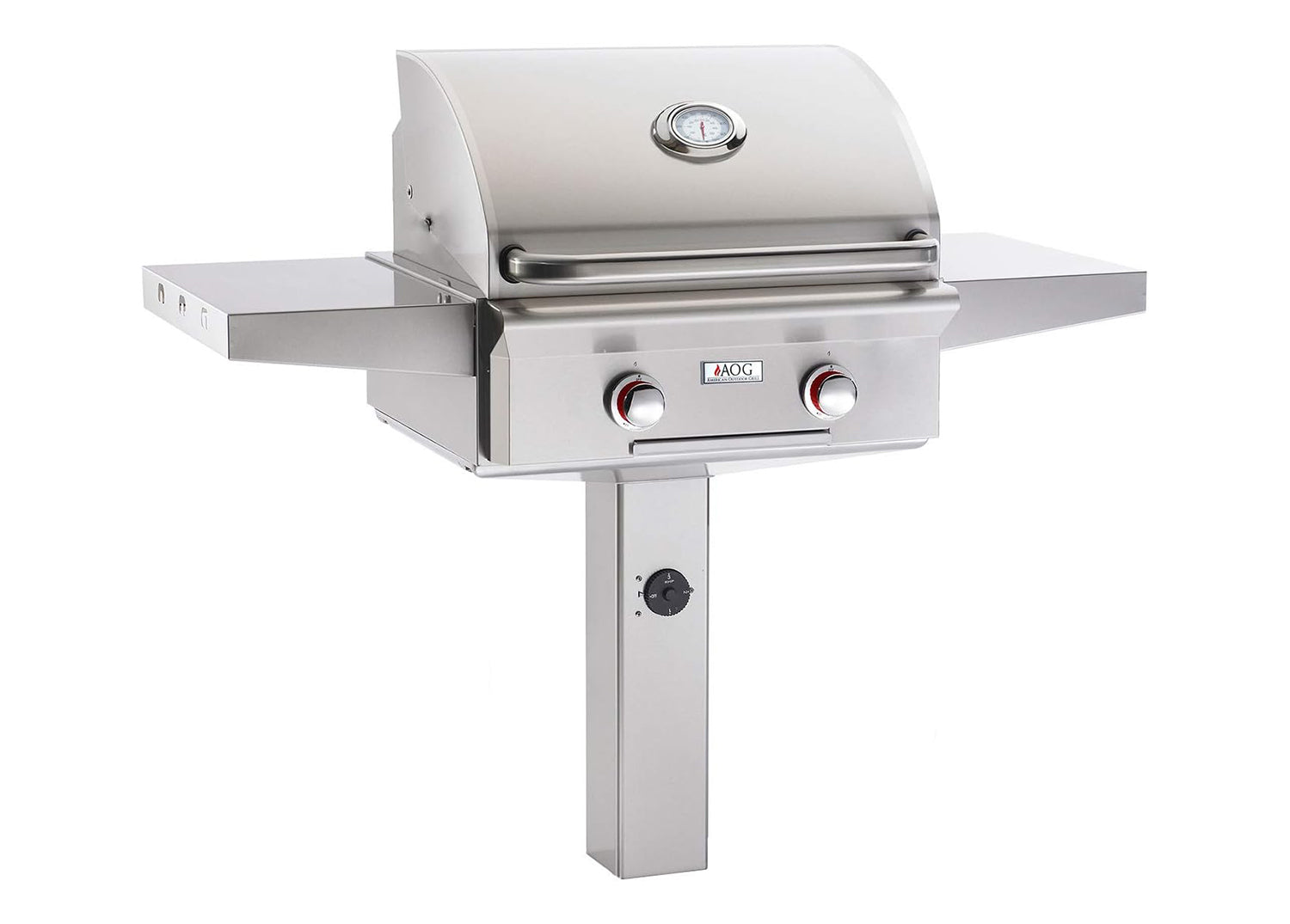 The 24 inch T-Series on in ground post natural gas grill from American Outdoor Grill provides a high end gas grill with a sturdy design. This unit features a complete 304 stainless steel construction to ensure a long lasting and durable product while the 24 x 18 inch grilling surface provides plenty of grilling area at 432 square inches. The (2) 16,000 BTU tube burners feature the same stainless steel construction and offer a large amount of heat to provide some serious grilling. The stainless steel vaporizer panels help to provide even heat distribution across the grilling surface to prevent hot and cold zones and prevent flair-ups a the custom analog thermometer features a stainless steel bezel for high quality temperature control. The stainless steel post features (2) stainless steel side shelves and is designed for a permanent in ground application. Exclusive to the "T" Series, this grill features the "Rapid-Light" piezo ignition for a reliable start every time and is backed by AOG's 15 year warranty.
