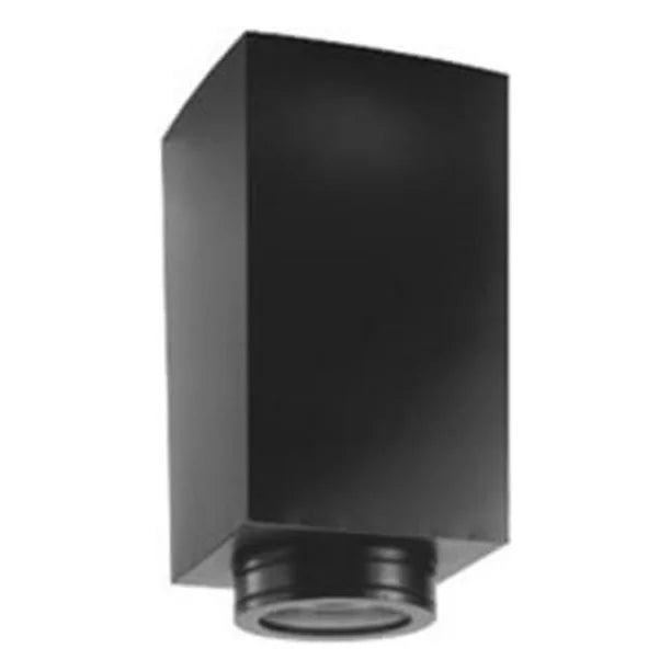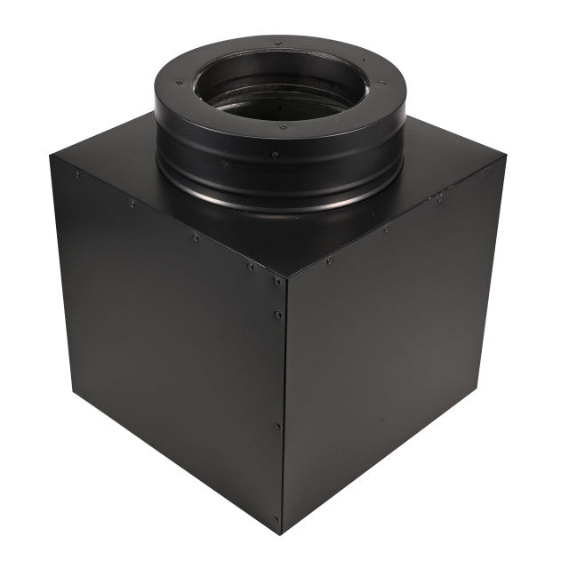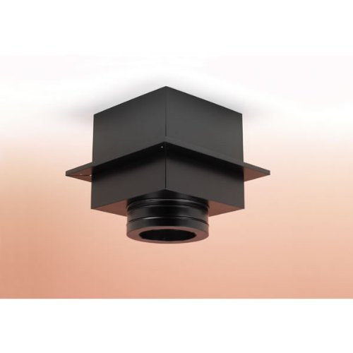 DURA PLUS TRIPLE WALL SQUARE CEILING SUPPORT BOX 14.25 x 14.25 x 11. Deep painted black. Used with flat to 4/12 pitch ceilings. Starter section built in supports up to 40 ft. of Dura Plus chimney. Includes square trim.
