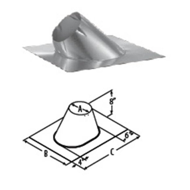 Use to weather proof the penetration of chimney pipe through the roof. Storm Collar required. Select roof flashing based on pitch of roof. For example, a 6/12 pitch has a vertical rise of 6" over a horizontal distance of 12". Made of galvalume. 6"-8" available with large base.