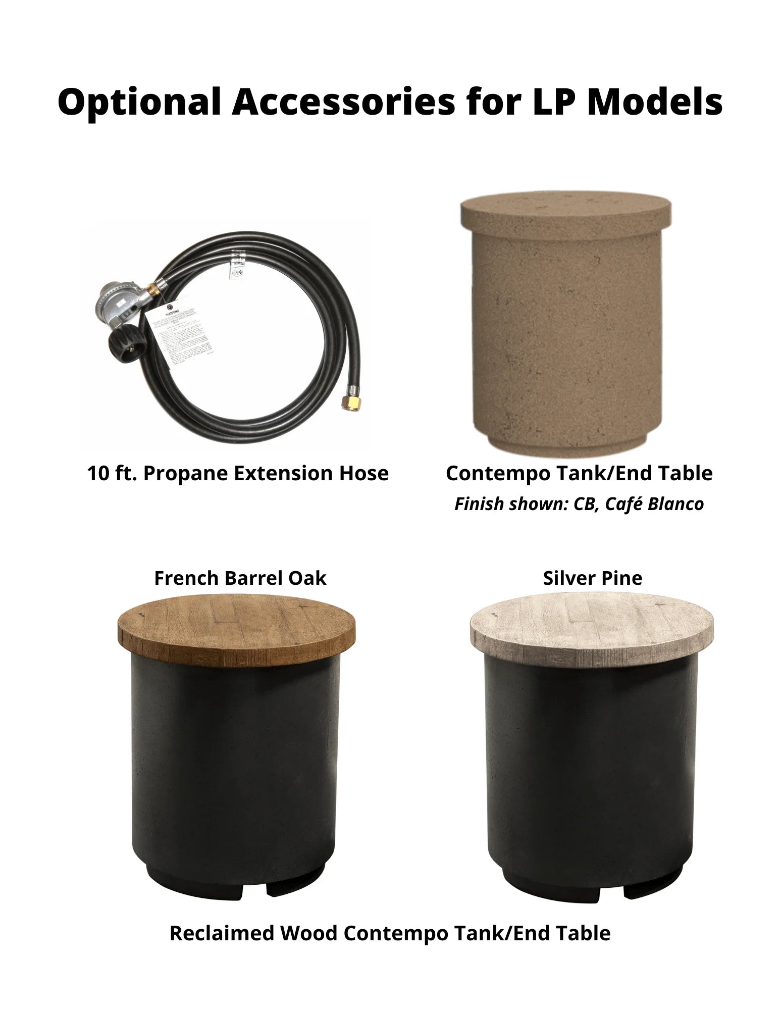 Note that this cannot accommodate a propane tank, but an optional tank cover/side table and hose are available for those who want to use this fire table with Liquid Propane. Select from two different reclaimed wood finishes or seven GFRC colors for the tank/end table.