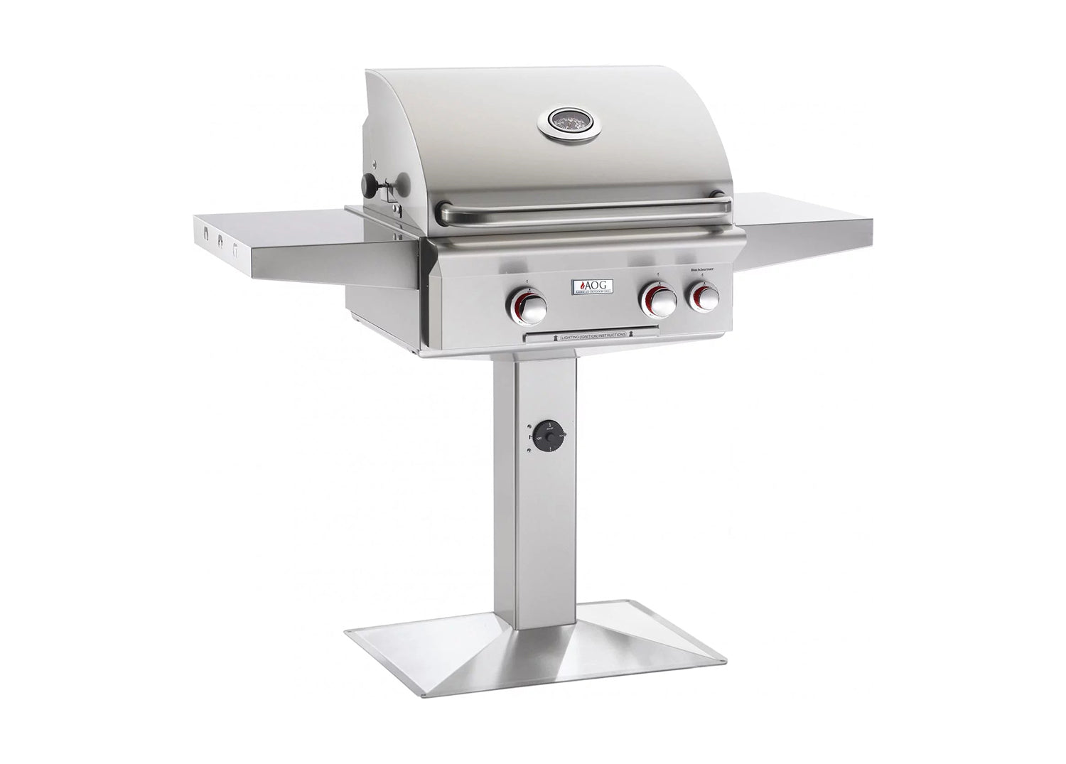 American Outdoor Grill T-Series 24-Inch 2-Burner Natural Gas Grill On Pedestal With Rotisserie - 24NPT. 24NPT. Gas Grills. The American Outdoor Grill post model collection is designed for long-lasting, unsurpassed performance that produces unbelievable flavor. All AOG pedestal grills may be bolted to a deck or concrete slab, and are optimized for parks, condominiums, apartments, and anywhere else where space is a premium. Furthermore, AOG pedestal grills feature a built-in safety timer that automatically shuts the gas off after three hours. Alongside the rest of the AOG line, they boast a stylish, sleek appearance, including the beautiful double-layered satin finish hood, stainless steel construction, and custom-designed analog thermometer with polished bezel. Proudly made in the USA and built to last, this AOG T-Series natural gas grill features commercial grade 304 series stainless steel construction, long-lasting stainless cooking grids and heavy-duty warming rack, and highly-sophisticated stainless steel 32,000 BTU U-shaped burners with integrated support posts for performance and durability. If you enjoy grilling veggies, steaks, and chicken all year long on an incredible grill, the first thing you will appreciate is the brand-new Piezo Rapid Light ignition, firing you up that much quicker with no electricity or batteries. Other great features on this grill include 432 sq inches of primary grilling space, stainless steel vaporizer panels (also called flame tamers) for even heat distribution, solid brass valves with red-flared front knobs for precise temperature control and longer life, and a funneled grease management system with slide-out drip tray for painless clean up. Roast a better bird with the high performance rotisserie kit with 10,000 BTU infrared back burner. Whether you enjoy entertaining the neighbors or rounding up the family for a fresh meal, this AOG 24-inch T-Series gas grill will add style and cooking excellence to compliment your outdoor li...