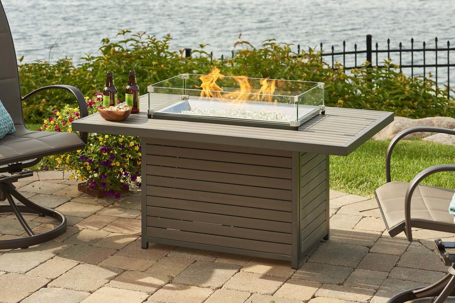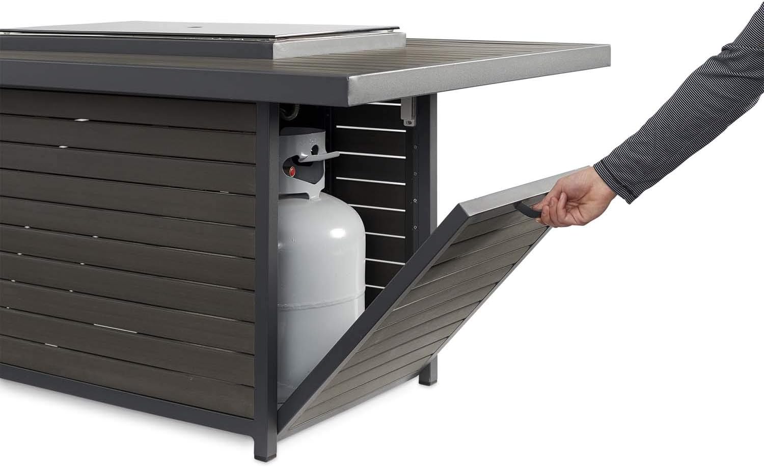 The Brooks Gas Fire Pit Table provides a substantial heat output to keep you and your guests warm on cooler nights. The adjustable flame settings allow you to create the perfect ambiance, while the hidden propane tank storage maintains a clean and uncluttered look. With an easy-to-use push-button ignition, you can enjoy the warmth and beauty of a fire with just a touch of a button.