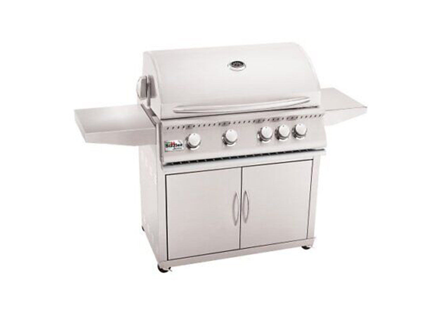Summerset Sizzler 32-Inch 4-Burner Freestanding Natural Gas Grill With Rear Infrared Burner. SIZ32-NG + CART-SIZ32. Freestanding Gas Grills. The Sizzler series by Summerset is designed to be an affordable, premium-style grill. Constructed with 443-grade stainless steel and built to ensure even heating, this gas grill offers a cooking experience that will satisfy outdoor chefs of any level. This 32-inch freestanding natural gas grill is powered by four 12,000 BTU 304-grade stainless steel tube burners that push a total of 48,000 BTUs. A 15,000 BTU ceramic rear rotisserie burner expands cooking options, allowing you to slow roast poultry and other meats (a rotisserie kit is optional). The cooking space measures 740 square inches, and the grates are built from 8mm stainless steel rods. The SIZ32-NG grill also features an easy-clean briquette system, which helps reduce flare-ups and ensures the grill has even heating across the grilling surface. Ignition is safe and convenient, thanks to a flame-thrower style ignition that also includes a manual flash tube backup. The hood of the grill is double-lined to help prevent discoloration, and it boasts a 3-inch temperature gauge which helps keep track of internal temperatures. The grill cart features double-door storage, fixed side shelves, and locking casters.Specifications