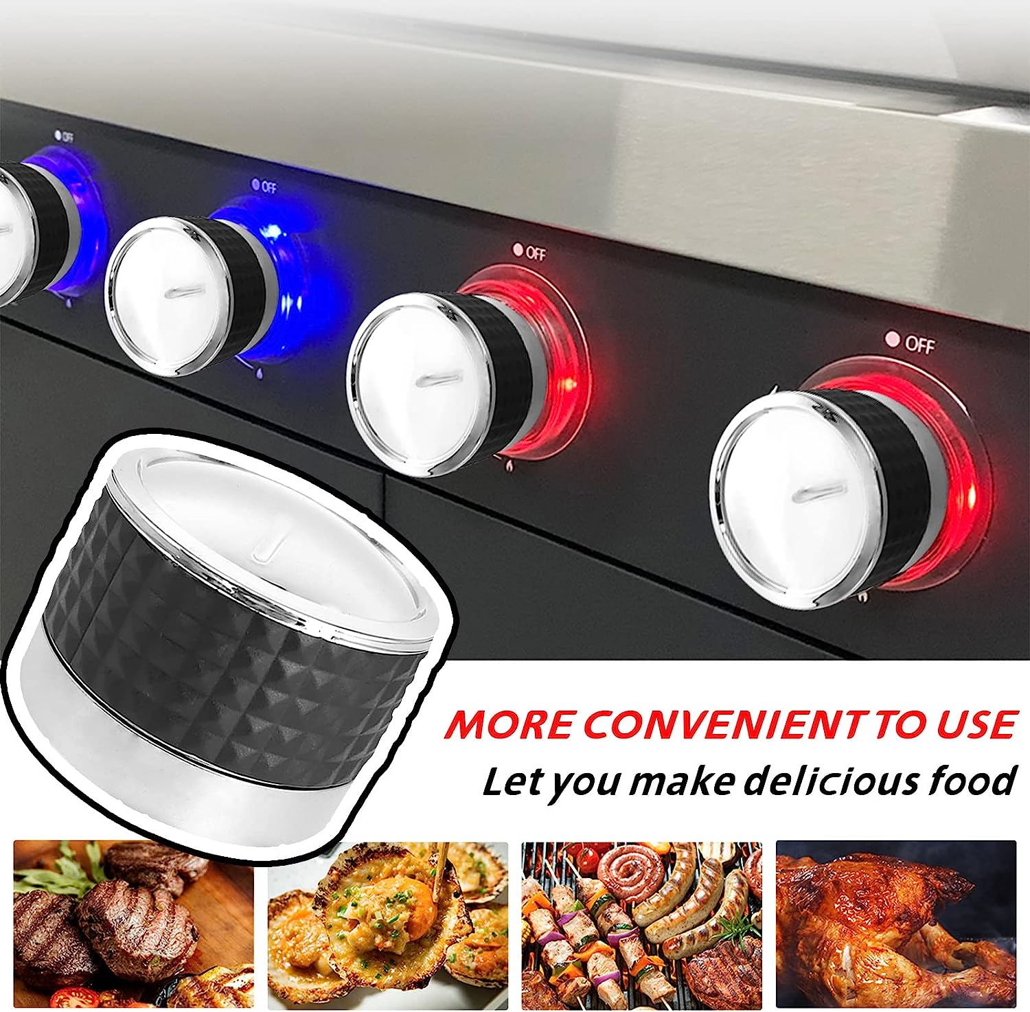 - High-Quality Material: The gas grill control knob is made of high-quality ABS plastic with a chrome-plated shiny finish and a non-slip silicone ring. Soft and easy to hold, good quality, and long use time.