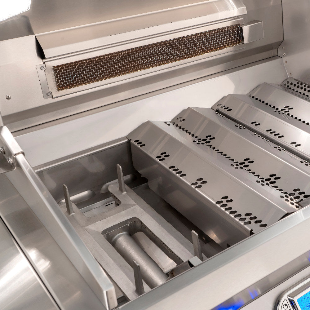 - 48-inch gas grill includes an infrared sear burner and three(3) thick cast stainless steel burners boasting 112,000 BTUs of cooking power.