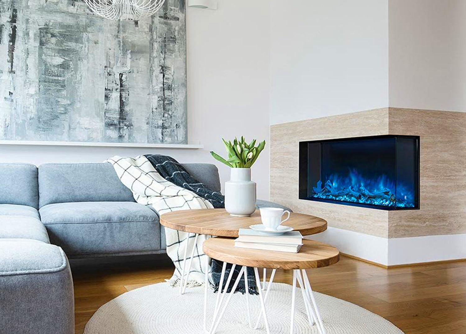 The Modern Flames Landscape Series Pro MultiView Wall Mount/Built-In Electric Fireplace provides a premium electric fireplace option for your home. This versatile three-sided fireplace unit offers a one-of-a-kind appearance for your space with high-intensity RGB flame options, ember bed, and accent lighting for a customizable appearance--easily match your fireplace to the mood of the room. Additionally, flames can be individually controlled or synchronized for variable firebox effects. Clear acrylic stone media, black smoke acrylic crystals, and hand painted driftwood logs offered further customization to give your fireplace a unique appearance, while an integrated high-efficiency PTC ceramic heater puts out up to 10,000 BTU and features a whisper quiet fan. A full-featured remote control with full RGB and brightness control rounds out the Landscape Series' impressive feature set, while an optional wireless thermostatic wall control upgrade is included to add even more convenience to your fireplace setup. Note: The mantel depicted in some of the product images is for inspiration purposes only and is not included with this fireplace.