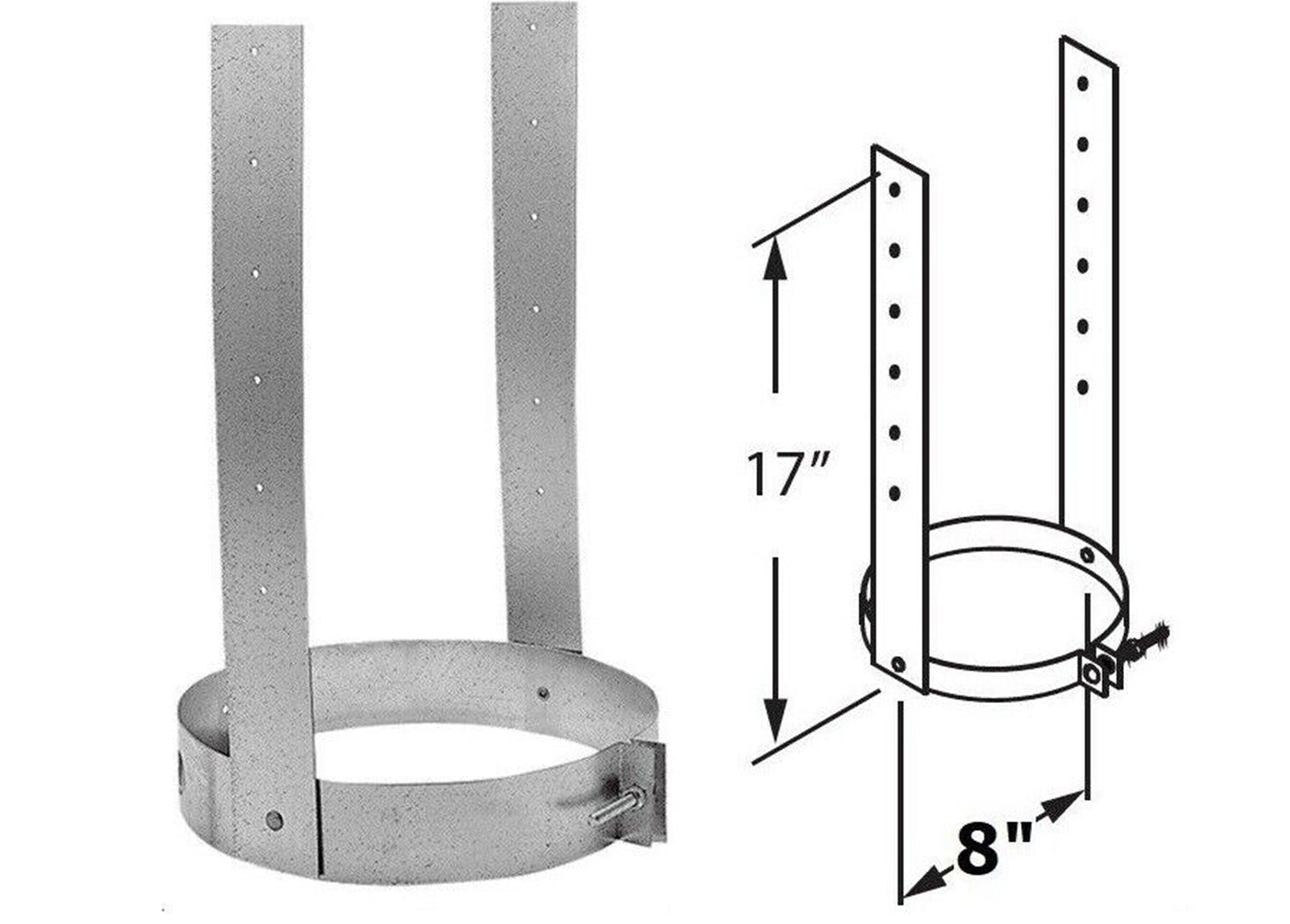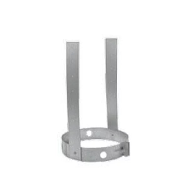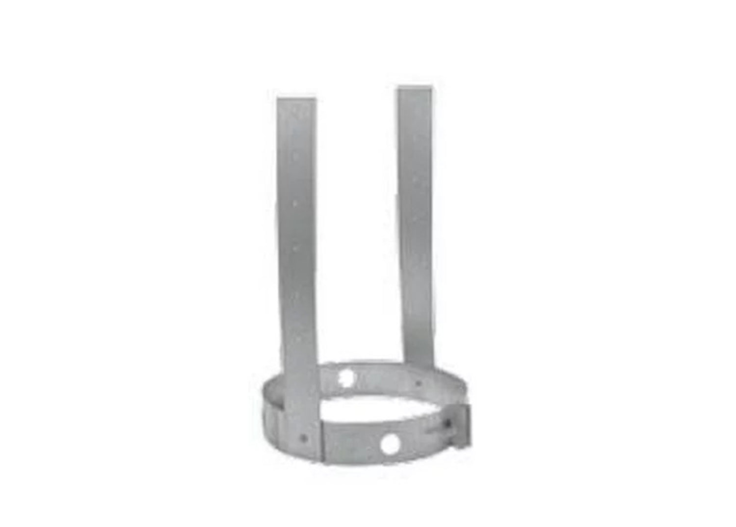 The DirectVent Pro 5" Inner Diameter Galvanized Elbow Strap is a component that is used in a typical venting installation. The galvanized elbow strap is used for supporting vent pipe between offsets.