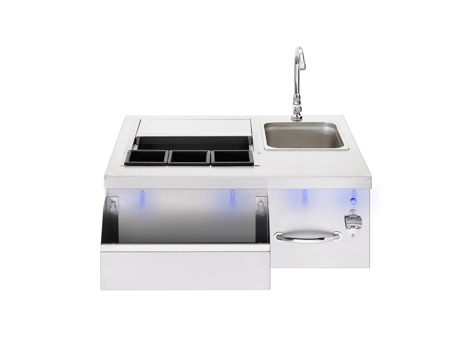Summerset SSBC-30L Beverage Center & Prep Station with LED Illumination, 30-Inches provides a high end outdoor beverage station, a terrific addition to complete your custom outdoor kitchen. The high quality 304 stainless steel construction ensures a long lasting product, while the matching Summerset handle coordinates with the Summerset line of grills for a seamless look. The complete beverage center offers a sink and faucet, built in bottle opener, and 40 pound ice compartment for a unique, one-stop beverage station - the perfect outdoor bar. Be sure to complete your outdoor kitchen with everything that you need, including this Beverage Center from Summerset.