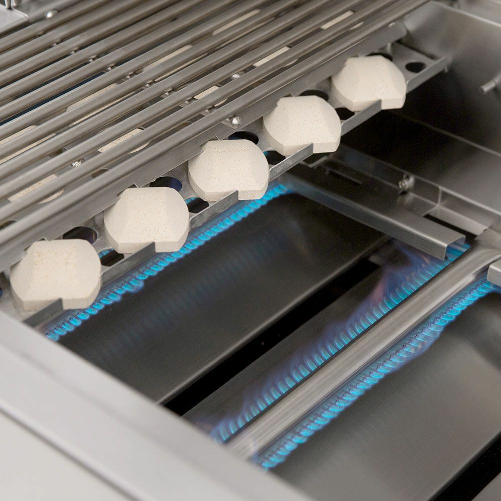 - Captured Briquette Trays - Unique ceramic briquettes sit above the burner to provide radiant heat and eliminates hot/cold zones across the 560 sq. inch cooking surface