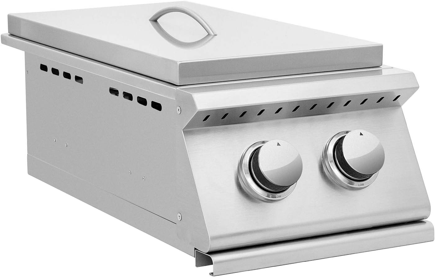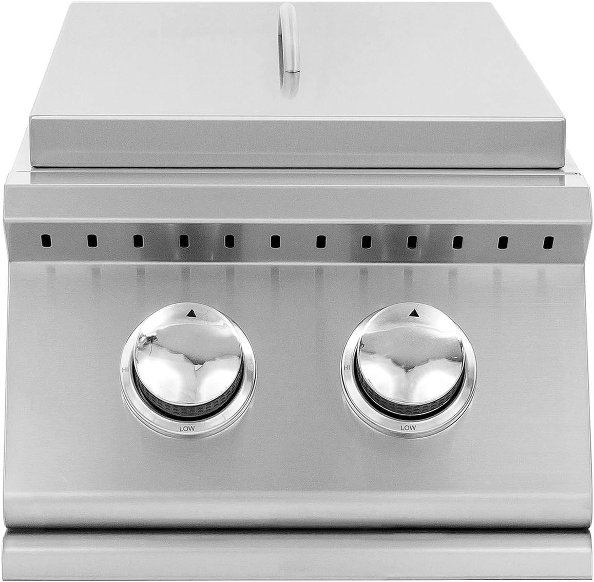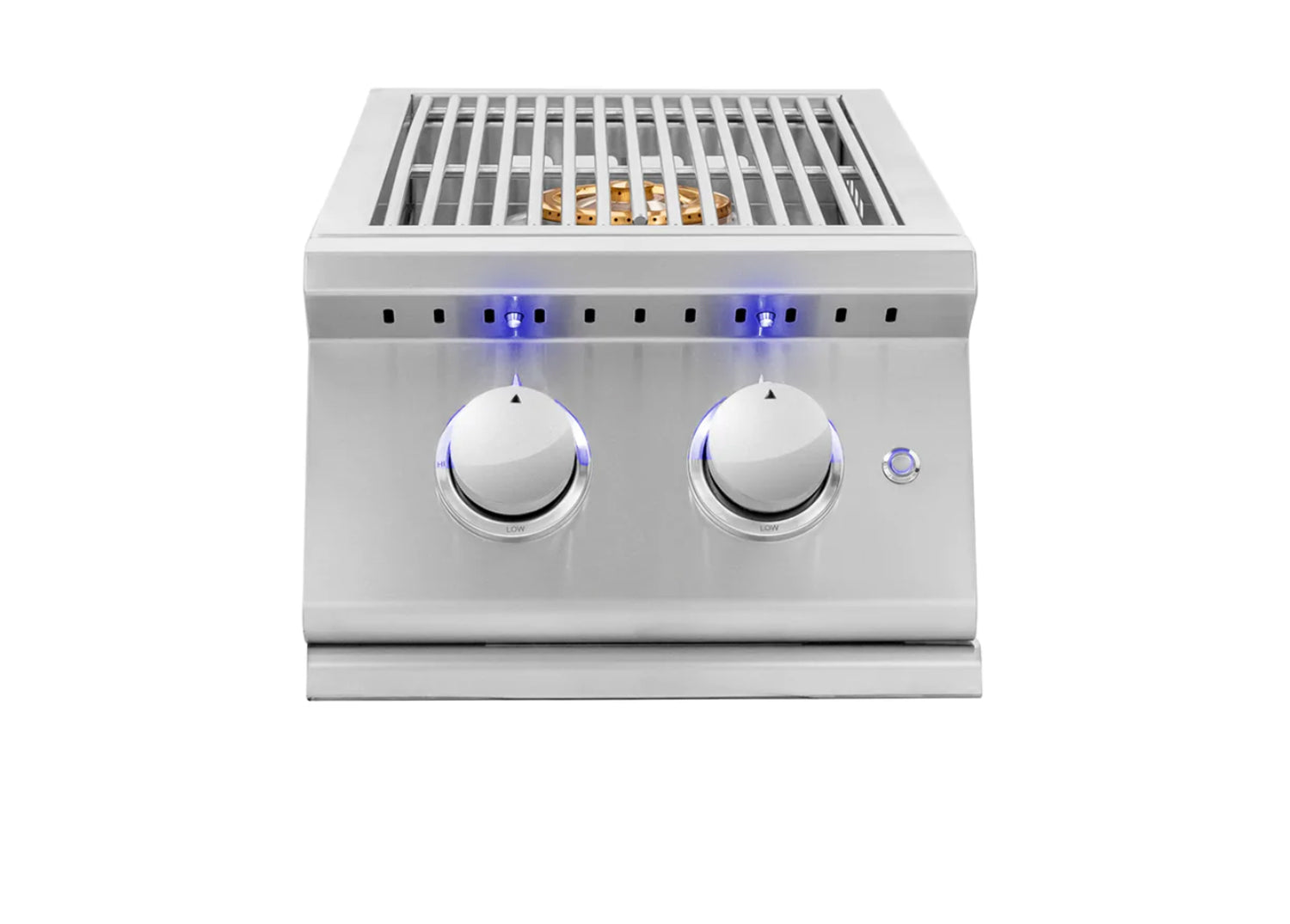 The Sizzler Pro Double Side Burner from Summerset Grills combines the benefits of an indoor range with the joy of cooking outdoors. The perfect addition to your outdoor kitchen, this side burner offers convenience and performance in one appliance. With matching design and exterior LED lights of the Sizzler Pro line, the Sizzler Pro Double Side Burner brings 24,000 BTUs of power to boil, cook, or saute while you grill. Featuring #304 stainless steel construction, heavy stainless steel grates, stainless steel lid, and industry-top warranty, you can rest assured this built-in appliance will last. Upgrade your outdoor kitchen today, so you're ready for the next backyard family feast!
