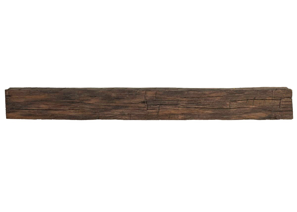 The Tobacco Barn mantel is molded directly from a 7.5” x 7.5” barn timber to authentically reproduce the beautiful seasoning imparted to the wood over time. Features include hand-hewn tool marks, deep checking, knots, and growth rings visible on the ends.
