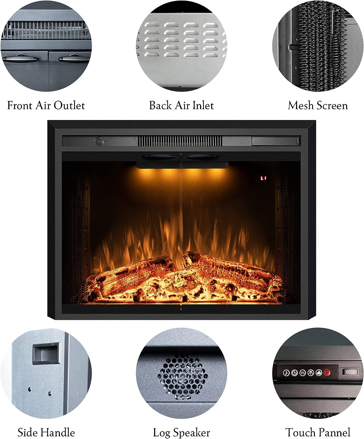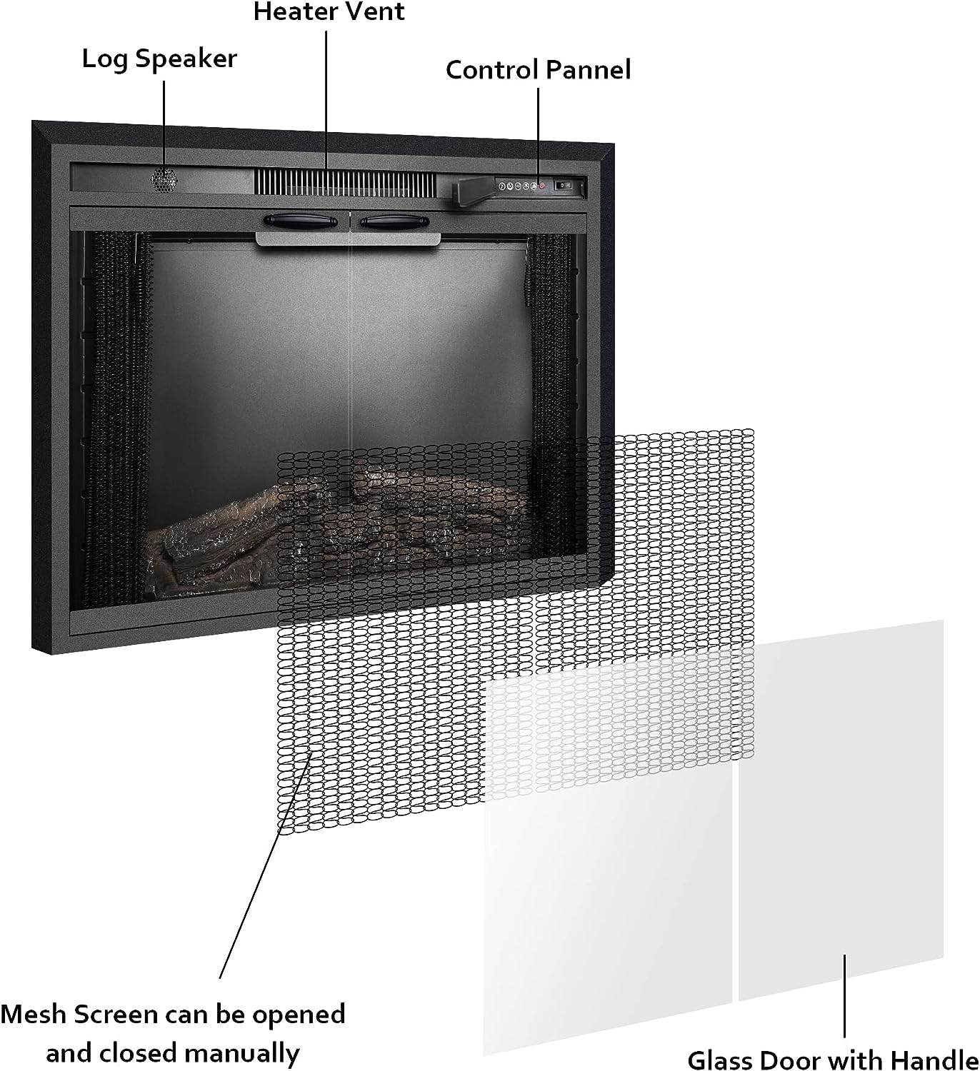 - Modern Design: Two sided interior brick wall and mesh screen design looks premium. The recessed fireplace is easy to install and dismantle. Touchscreen panel and remote control for common functions: heater, 1-9H timer, flame, top light and log speaker.