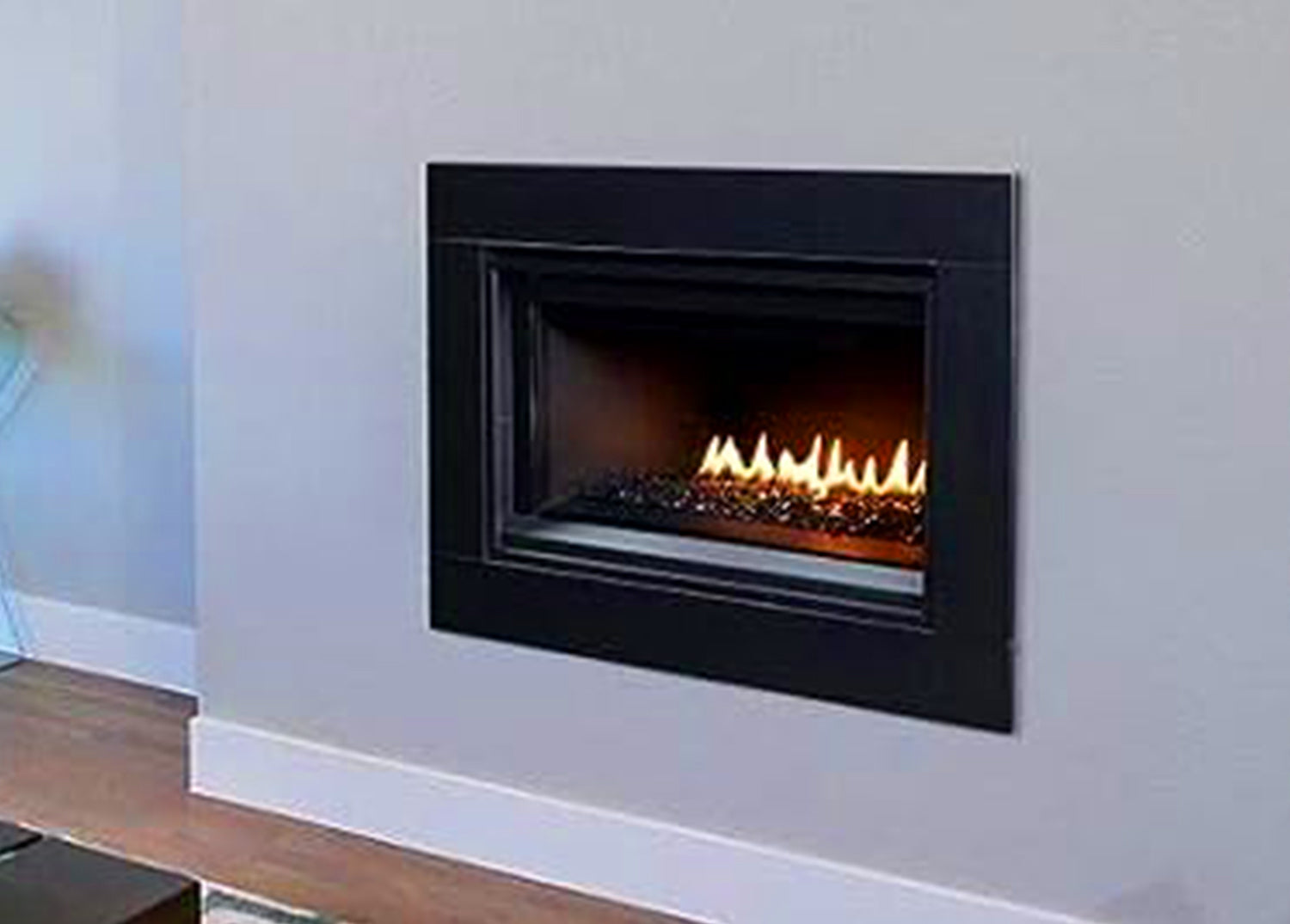 The DRL2000 Series linear direct vent gas fireplace offers a clean faced, low profile design that is just right for contemporary and transitional spaces. Its sleek opening provides an exceptional view of the gently dancing flames rising through the beautiful reflective black glass floor media. Reflective black porcelain interior liner, heat circulating blower, remote and wall controls are available as optional accessories, making the DRL2000 Series a smart choice. Note: This fireplace meets all ANSI Z21.88 barrier requirements. Features: BTUs: 18,000-13,000. Fuel Type: Natural Gas. Electronic ignition with battery backup provides continued operation in the event of a power outage. Clean-face design with integrated tile stops for easy finishing. Outstanding heating efficiency for increased comfort and lower operating costs. Standard tempered glass and a protective screen. Reflective black crushed glass media included with several optional colors available to customize the look. Black painted interior (optional porcelain liner available). Optional blower and hand-held remote controls available for all models. Durable textured powder coat finish. 20 year limited warranty. Specifications: Overall Dimensions: 45.5'' (W) x 17'' (D) x 24.75'' (H). Framing Dimensions: 45.87'' (W) x 18'' (D) x 29'' (H).